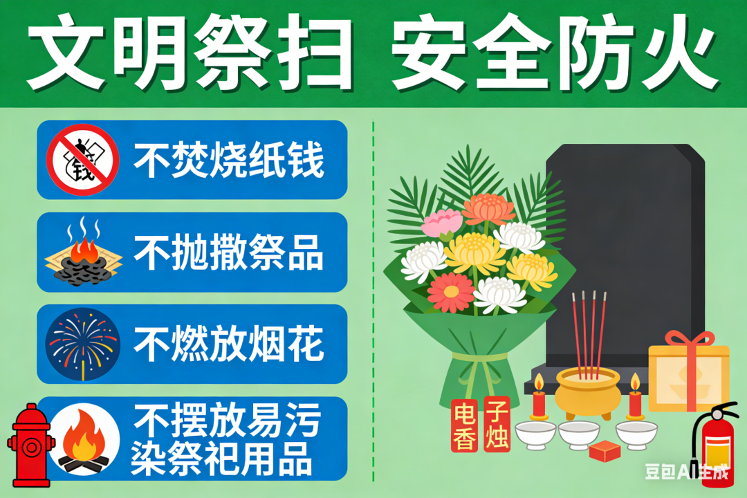 严格遵守森林草原防火和消防安全法规,自觉做到不在林地、草场、街道、绿地、广场、景区等公共区域焚烧纸钱、抛撒祭品、燃放烟花等,不摆放易污染、难降解的祭祀用品,坚决防范各类火灾事故发生。合理安排行程,遵守交通法规,文明出行,保障人身和财产安全,共同维护安全有序的祭扫环境。