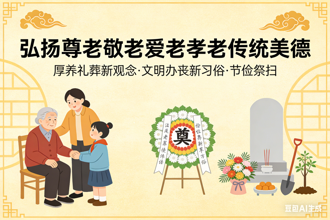 弘扬中华民族尊老、敬老、爱老、孝老传统美德,带头多尽孝道,多关爱老人,使其老有所期、老有所乐。树立厚养礼葬新观念、文明办丧新习俗,强化依法治丧观念,在祭祀活动中不妨碍和影响社会公共秩序,在潜移默化中引导群众改陋习、树新风,以好家风带动民风、乡风向上向善。